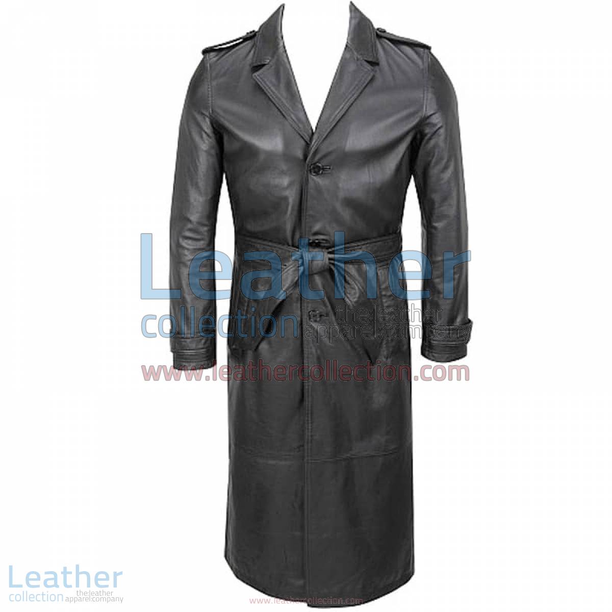 Belted classic leather long trench coat, genuine leather 0.9 – 1.0 mm, button front with notch collar, button cuff tab, attached shoulder tabs, welt hand pockets, 20″ back vent, removable tie belt at waist. Get it for a modest price.