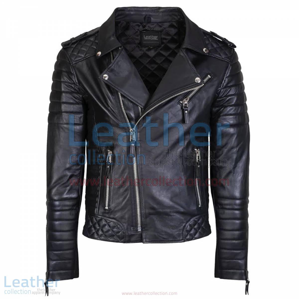 An exclusive design of biker men black quilted leather jacket with ribbed detail on shoulders and sleeves. It is constructed from nappa sheepskin. Gone through various tests for reliability, quality and durability. Get it for a modest price.