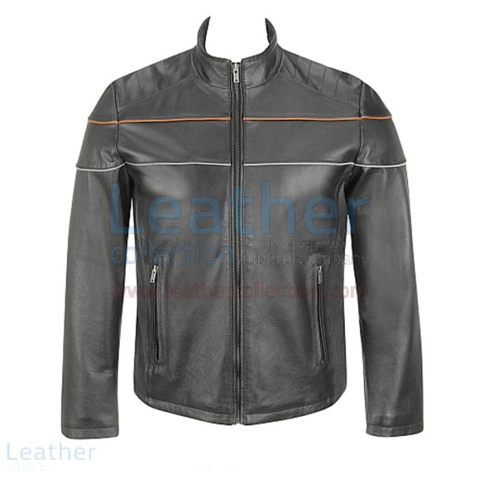 Black leather moto jacket with piping on chest, made of high-quality leather, original YKK full zipper front, cuffs and pockets, full-zip front with stand-up collar, 7″ zippered vent at cuffs with contrast-color gusset, and extra features.