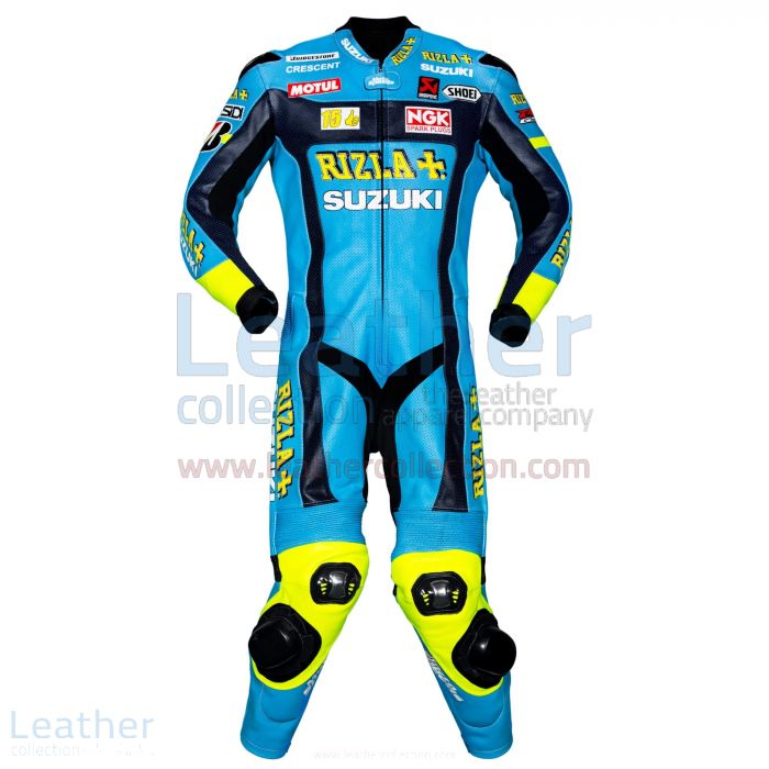 - Rizla Suzuki motorbike leathers features top grain cowhide leather of 1.2 to 1.3 mm thickness.