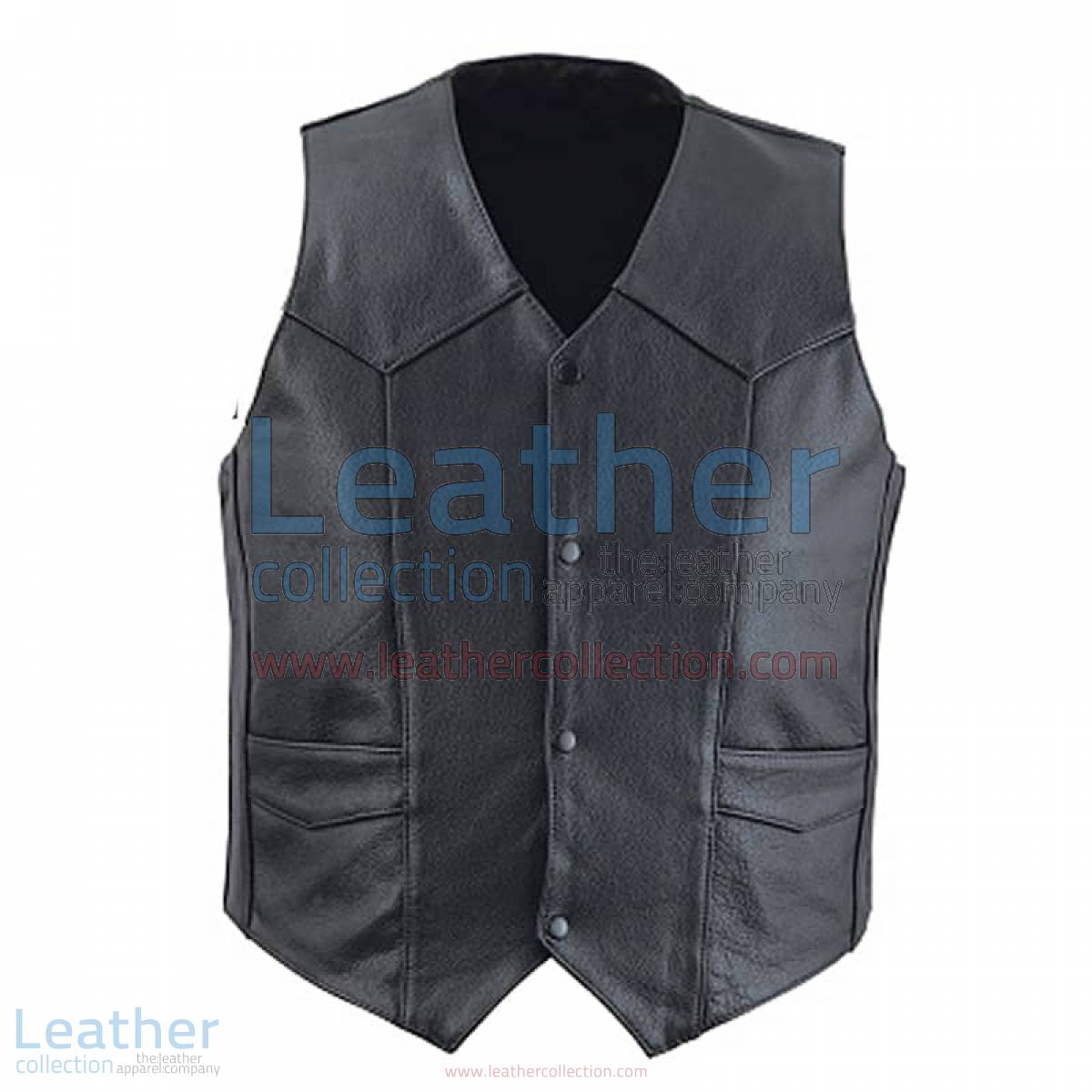 An exquisitely designed classic black leather vest for men having particular features like four button on the front, two side front pockets, two inside pocket, closed sides. Made of premium leather Grab this black vest now for a good price.