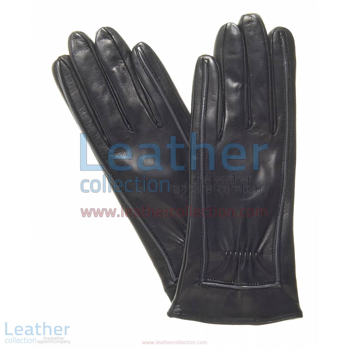 A totally different style of fashion ladies black leather gloves, an almost hidden contrasting welt sewn into the back side of these gloves makes a distinctive impression in this unique designed cashmere wool lined leather decorative stitching gloves for women.