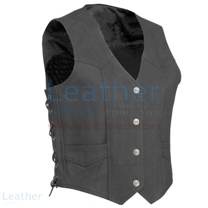 Diese perforierte Motorrad-Lederweste kommt mit der Perforationsfunktion. aus feinem und reinem Leder mit einem sehr geringen Gewicht für einen eleganten und auffälligen Look. mit vier vorderen Druckknöpfen, Schnürung aus Leder und horizontalen Taschen.