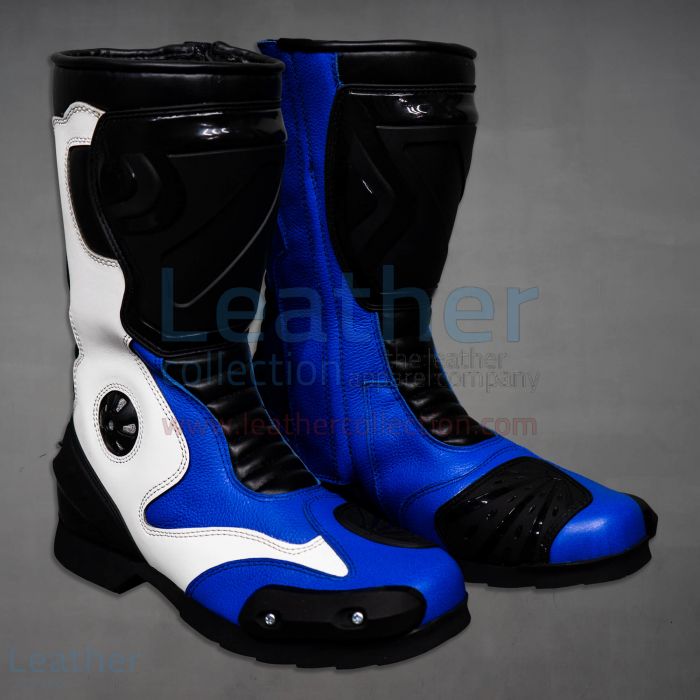 bottes de motard bleues: bottes de motard en cuir bleu inspirées des besoins spéciaux des motards. Excellent cuir défensif. Flexibilité totale et mesures supplémentaires pour garantir la résistance aux abrasions et aux chocs