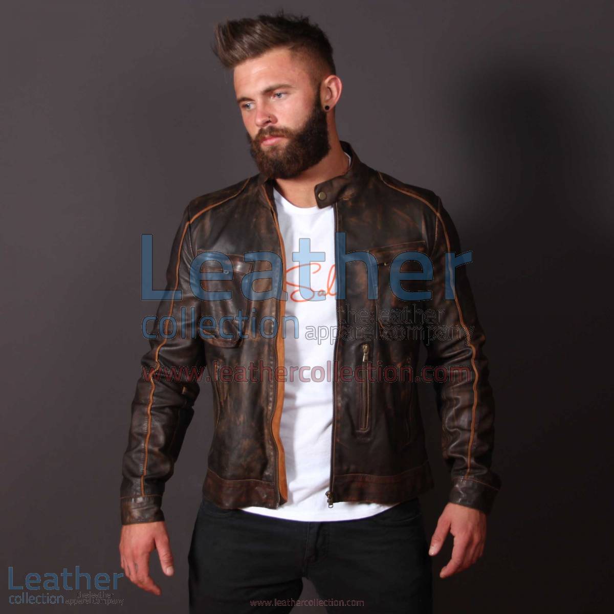Leather outlaw jacket for men, a two-tone jacket, made with Italian sheepskin. To achieve the two-tone effect it’s been put through the process of stone wash and then wax with a little hint of acid. This jacket has a standalone collar with snap button and front steel zip fastening.