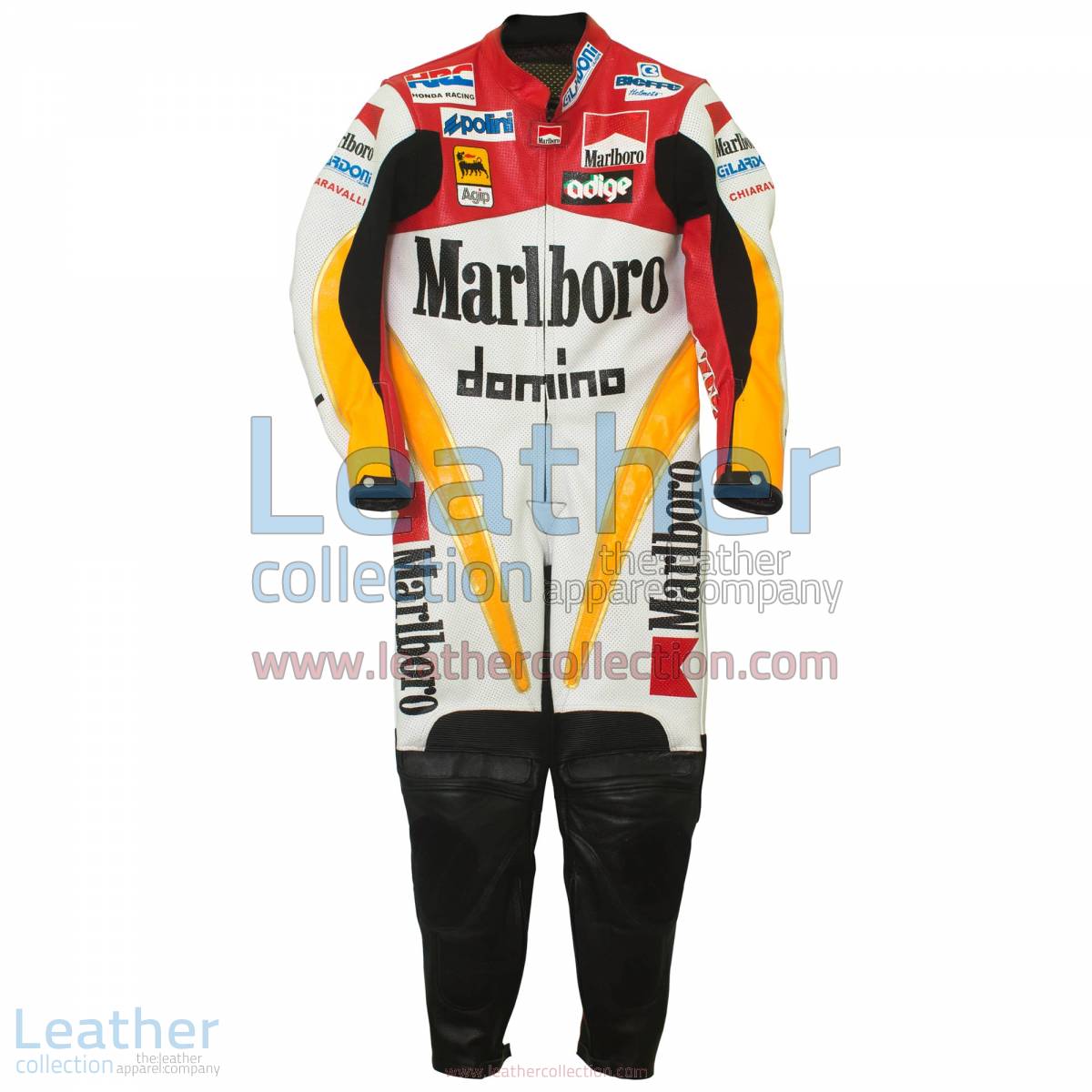 Honda racing suite with greater security. Optional perforation available, optional Schoeler and Kevlar stretch materials. The Loris Capirossi Honda GP 1995 races are available in all sizes and complete customization.