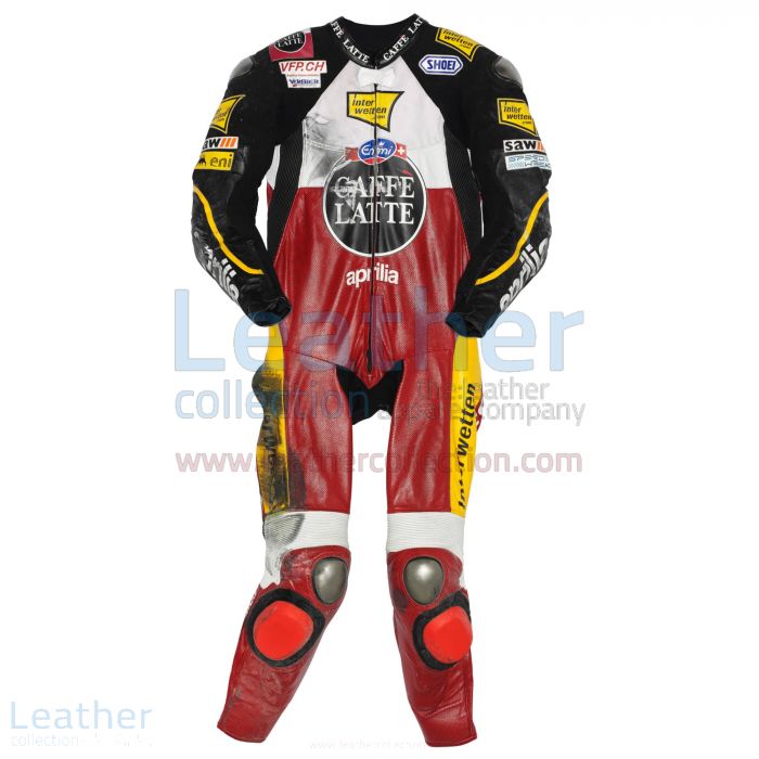 - Aprilia leather suit made from selected top grain leather that is especially processed and drum dyed for excellent abrasion resistance and durability.