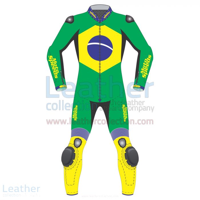 Brazil Flag Moto Race LeathersBrazil flag moto race suit. A one of the patriotic designed motorcycle suit with promising extra modified features related to protection from accidental abrasions and cuts. Made under proper supervision keeping the comfort and safety of the rider in mind.