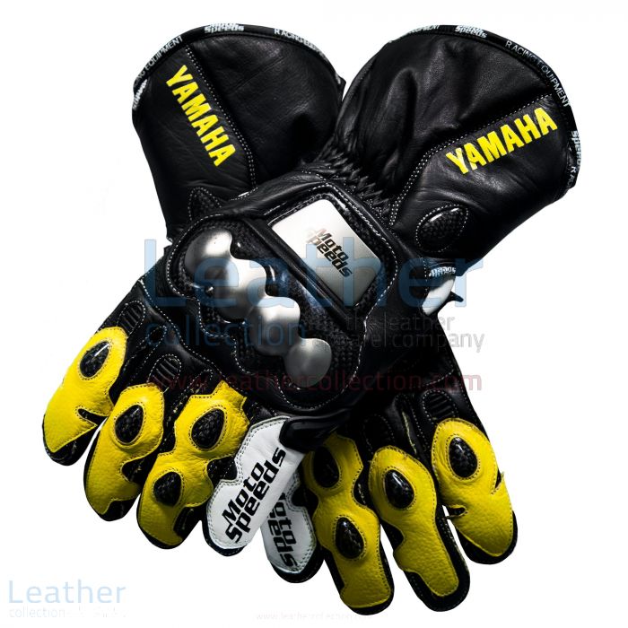 A high profile and perfect matching pair of Leather Motorcycle Gloves can be matched with Yamaha Racing Leather Suit Yellow excels top grade leather and safety materials.