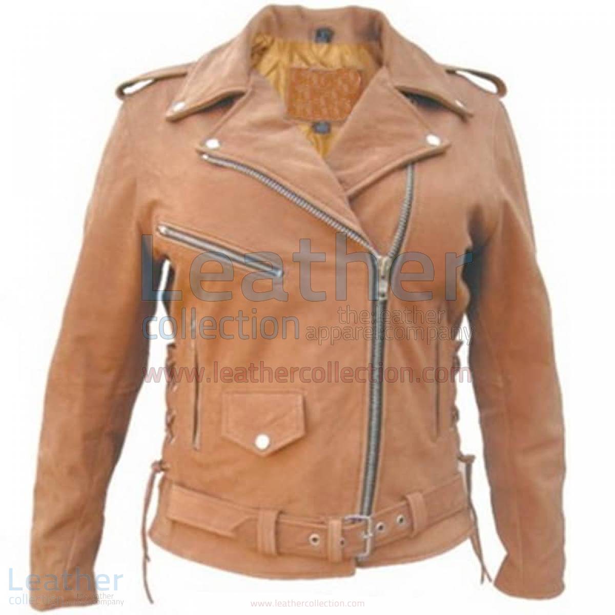 A stylish brilliant jacket made of high-level leather. Brown ladies motorcycle jacket is made for professional lady bikers to keep them safe and fashionable. Introducing special features about zippers, pockets, full zipped front and snap collar. Get it for a reasonable price.