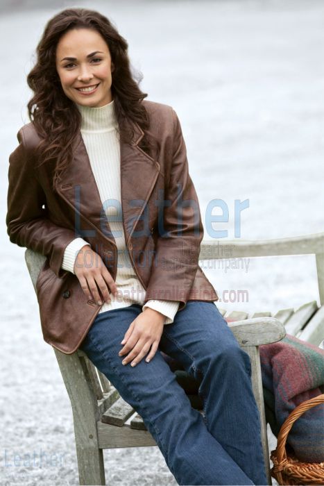 Leather peacoat for womens features Great tailored look in distressed brown leather. Broad lapels and double-breasted front lend extra eye appeal. Asymmetrical styling offers a slenderizing look