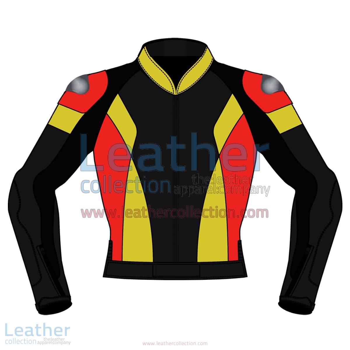 Tri-Color Leather jacket with expanded security and solace. Defensive leather, outer defenders on elbows and shoulders, adjusted ventilation to shield the rider from heat. It can be further customized according to color, size, design and more.