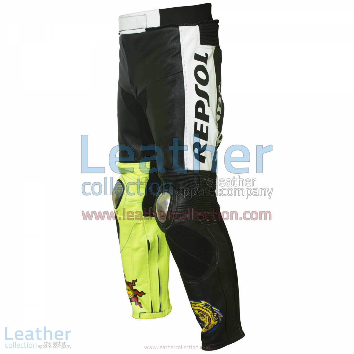 Valentino Rossi Repsol Honda MotoGP 2003 Pants are available in all sizes and desired designs with extra safety features. Including nylon thread for maximum safety and CE approved dual-density armor. Avail it anytime from any corner around the world.