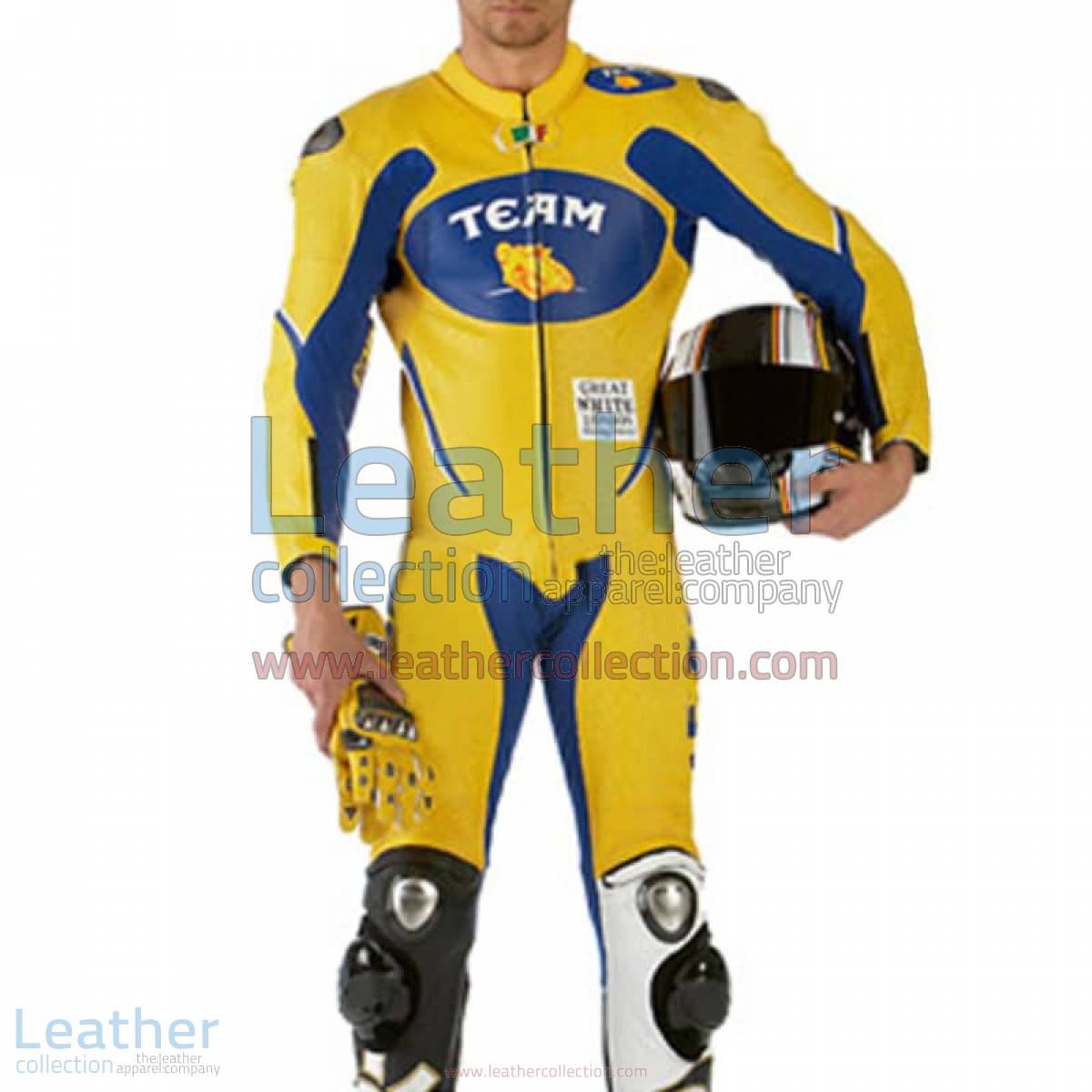 This VR46 Team motorcycle racing leather suit is made regarding the high-level reliability and durability measures to ensure that the customer gets a prolonged race of safety and comfort. Order Valentino Rossi clothing anytime.